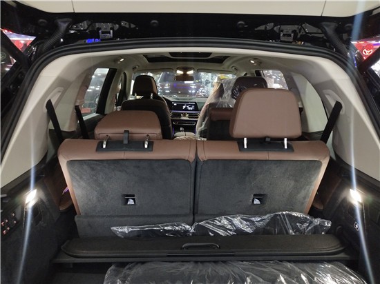来到第二排,X7配备三段式星空全景天窗,前排座椅背部提供两块娱乐系统显示屏,后排独立空调下方还集成了储物格、双USB Type-C充电接口、12V电源以及娱乐设备,同时B柱也配有空调出风口。六座版车型第二排为两个独立座椅且带有电动调节功能(7座车型第二排还支持前后14.5cm的滑动调节),上方配备两个头枕,内侧配有座椅扶手,大幅提升了乘坐舒适性。 第三排为两个常规座椅,支持一键便捷进入,提供照明灯、杯架等常用配置。后备箱方面,宝马X7配置同样齐全,除包括基础的照明灯、电源、锚点以及挂钩外,还配有后两排座椅的一键放倒、打开功能,大幅提升了使用便捷性。