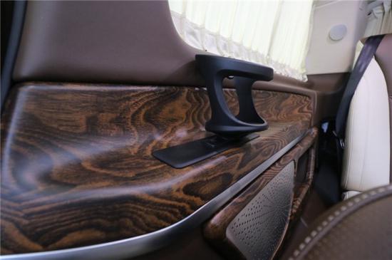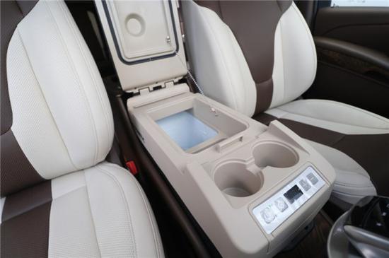 奔驰商务车v260新款正副驾驶座的中央扶手被一台进口车载冰箱所替代,冰箱带还有冷冻功能,虽然它的容积不是很大,但在旅行中常用的食品及饮料的放置都是没有问题的,实用性也非常高。