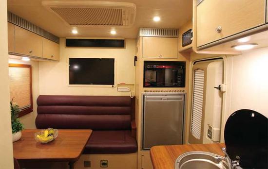 中门进口三级电动翻转式活动踏步;进口带灯中门上车扶手;进口中置房车乘客门;进口AC220V电陶炉;国产AC220V微波炉;进口顶排式抽油烟机;进口房车专用冰箱(110L);进口高档咖啡机;1个橱柜,1个组合式电器柜,顶部吊柜;橱柜上安装进口带盖。驾驶区集成空调系统,矩形通风天窗;生活区1个3KW底置式空调(带正压式新风系统,带粉尘过滤排风系统);进口9KW全自动独立燃油加热器;雨量感应式卫生间换气扇;前、后部进口带遮光帘式手动房车天窗;正副司机门电动车窗;生活区进口房车外推窗。