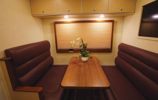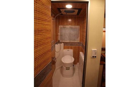 带淋浴防水卫生间;进口自带黑水箱式电动冲水马桶;一体式水龙头淋浴花洒;进口全自动水路,进口智能水泵,圆形重力加水口,外接20米加水管;换热式热水器;200L不锈钢净水箱,55L不锈钢灰水箱,28L马桶自带黑水箱;手动排污阀;净水箱、灰水箱电加热防冻装置。