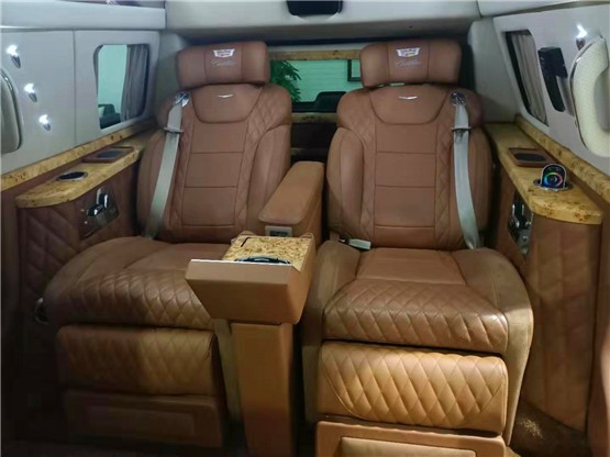 凯迪拉克总统一号整个后舱为四座规划,两个主座为至尊奢华真皮头等舱座椅款式,且带腿部支撑和电动按摩加热功用,四座椅头枕处均印有凯迪拉克标识。主座椅中央扶手处还设有控制台,让您置身舒适的座椅不必动身就可操控车内设备,相当人性化。