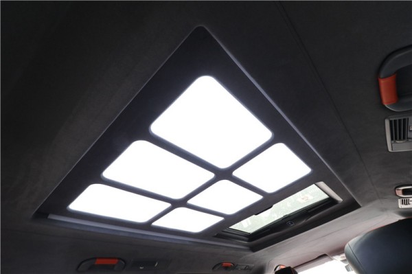 进口奔驰7座商务车Metris的地板选用美观耐磨的柚木地板,在B柱配有两个精致的氛围射灯,电动滑门处也都用钢琴烤漆饰板装饰,细节非常考究。顶部采在车灯采用迈巴赫式的宫格顶。