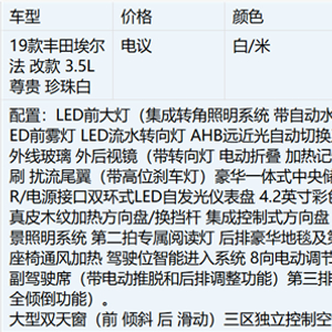 19款丰田埃尔法商务车选用航空头等舱等级的多功用座椅,限量版每个座椅都精心调配了至尊打孔皮革,它不 再是单纯意义上的座椅,而是躺椅于一体的休息空间。进口埃尔法车内的设计很有格调,更多表露出来的是气派和动感。中控台布局十分清晰,第三排座椅加14公分 第二排阅读灯 可收纳写字台 座椅加热通风。