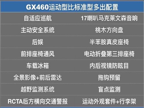 19款雷克萨斯GX460 运动版 配置:V8 4.6L、七座、非承载式车身、6挡手自一体、18寸轮、12气囊、空气悬挂、底盘升降、动态调节悬挂系统(KDSS)、中央差速锁、天窗、氙气大灯、LED日行灯、大灯清洗、半苯胺高级真皮座椅、电动座椅主驾带记忆、前后座椅加热、前排座椅通风,智能钥匙、三区自动空调、8寸屏导航、蓝牙、4摄像头环影、电动真皮桃木加热方向盘、定速巡航、桃木内饰、胎压监测、电动调节外后视镜(自动折叠、记忆功能、可加热、LED转向灯、倒车自动角度调节)。行李架,后拖车钩,运动套件(前后杠银色扰流板、前杠镀铬条、尾门镀铬条、后杠不锈钢饰板,尾喉),冰箱,三排座椅电动折叠,马克莱文森17喇叭音响,7寸双屏后排娱乐,远程摇启,前后雷达,雷达测距,PCS预碰撞系统,BSM并线盲点监测,RCTA倒车侧后方盲点警示,CCS自动爬行系统,MTS多地形选择系统。
