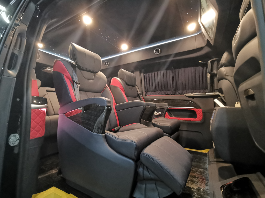 进入奔驰威霆7座改装后舱,立刻就会被它的豪华绚丽而征服,整车环保真皮包裹,游艇级柚木地板铺设,豪华感无处不在。全部采用真皮制作,豪华木饰装点,带有按摩加热通风功能。后舱前为两个独立航空座椅,第二排座椅安装进口首席航空座椅,加热通风按摩功能齐全,最大限度的减缓您的乘车疲惫。八向电动调节:电动头枕,电动腿托,前后电动调节,电动靠背调节。第三排为一组沙发座椅(可电动展平,形成一张舒适的沙发床)。