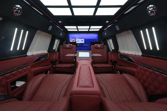 凯迪拉克总统一号采用4+2座椅布局,在后排两个航空座椅对面,是有两个可以折叠的电动座椅,可以临时乘坐,设计非常的贴心,车辆顶篷全部采用了麂皮包裹,手感还是看上去的质感都很好,与前排驾驶员之间的隔断可以自由的升降,也保证了后排乘客的隐私,隔断上面的电视机同样支持升降