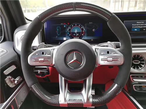 19款全新G63内饰方面,新G63保留了新G500的整体设计,除配色差异外,新车还换装了全新造型的平底式AMG运动方向盘,其两侧配以打孔皮质包裹,下部镀铬装饰的造型也与新G 500明显不同,看上去十分战斗。此外,全液晶仪表盘+中控大屏的双12.3英寸屏幕设计在新车上也没有缺席,营造出了浓郁的科技感。