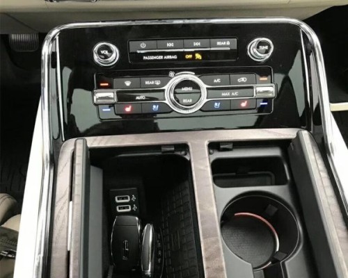 林肯特有的电子按键式换挡被设置在了中央出风口的下方,类似钢琴键式的设计更显精致,而且节省了空间。中控台并非整体贯穿式设计,操作区域和杯架、中央储物格整体呈航空母舰上飞机跑道的造型,胳膊置于扶手上就能轻松地进行各种操作。