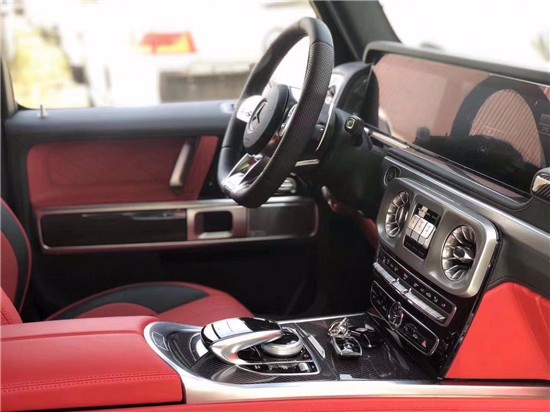 19款奔驰G (配置|询价)63 AMG内饰方面:奔驰G63 AMG与前代车型相比,奔驰G63 AMG在车内应用了更多创新技术。奔驰G63 AMG标配新式仪表盘和最先进的COMAND APS NTG 4.5驾驶室管理和数据系统。奔驰G63 AMG还配备了带彩色TFT显示屏的AMG仪表盘、AMG主菜单和单独的挡位显示器以及采用白色照明的AMG门槛。