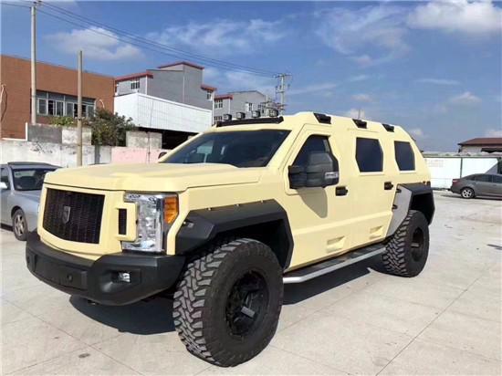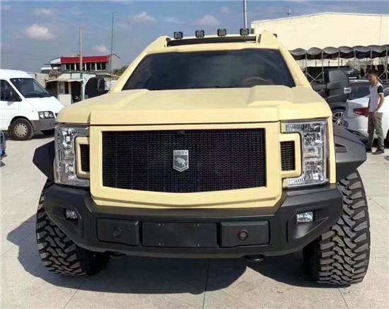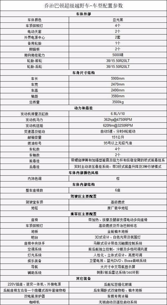 新款乔治·巴顿越野车是一款美国产超级越野车,在国内只有很少的数量。此车以二战时期美国将领乔治巴顿起名,因为这两款车都有较好的续航能力和越野能力。老款乔治·巴顿 搭载的是V10发动机,排量为6.8L,乔治巴顿内饰搭配6挡自动变速器。内饰采用了双色混搭,座椅纯手工缝制,看上去非常舒服,有着一种优雅古典的格调,特别是驾驶舱内有夜视系统、卫星导航、防生化毒气系统、供氧设备等安全设备,还有多媒体影音视讯系统、高科技卫星侦测系统。