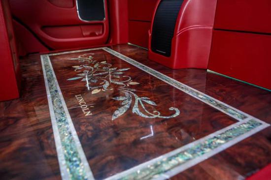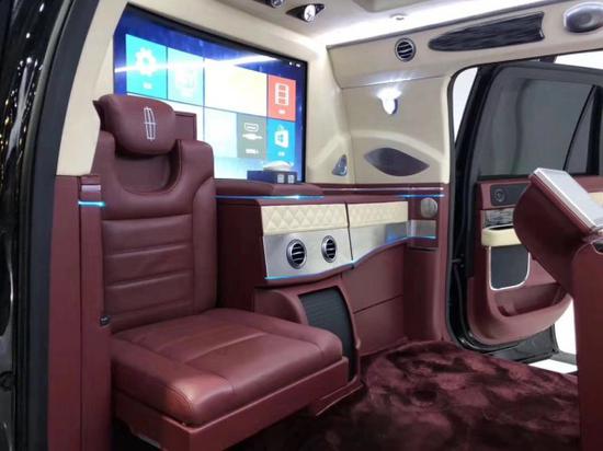 作为一款奢华的房车,重头戏当然是后面了,印花高级柚木地板,小牛皮红色内饰,顶灯,氛围灯,电动窗帘,可折叠座椅,车载胶囊咖啡机、冰箱、高级英语影音设备等应有尽有,林肯领袖一号的隔断系统同时是高清液晶显示器,可供乘客观看大片,随时随地的观看各类节目满足您对豪华商务车的一切幻想。