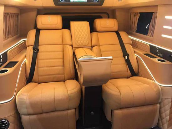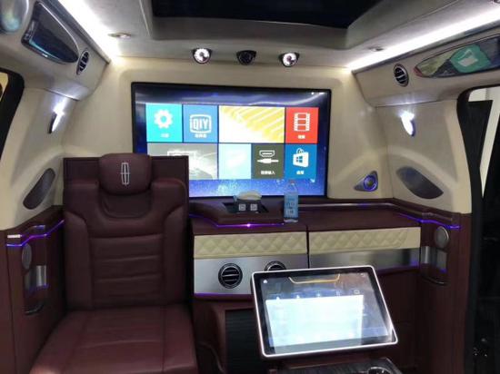 林肯领袖一号内饰有6个座椅,其中有两个座椅是隐藏式,不使用它时,它与吧台形成一体,座椅也可以单独使用,两个座椅上方是32寸液晶电视,电视可以升降,它的作用就是能与驾驶室隔开来,不过林肯车内都装置有对讲系统,林肯领袖一号后舱独立功能很多,空调,电器等等,老板坐后面一定是很理想的座驾。