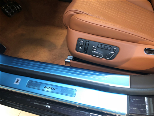 V8S标配20英寸轮圈,6辐21英寸是需要选装的,大轮圈和硕大的车身更相配,5299mm的车长让整体造型非常舒展,独特的车身颜色更容易被青年才俊们接受,侧面线条并不复杂,一根腰线高且宽大,给人以昂首挺胸、气度非凡的感觉,尾灯被一根镀铬饰条包裹,做工考究,符合车尾造型定位,简洁大方又不失优雅,车尾各个灯组点亮效果均较清晰,带状高位刹车灯提示效果出众,双边双出尾排露出部分有镀铬装饰,凸显力量感的同时又不失稳重。