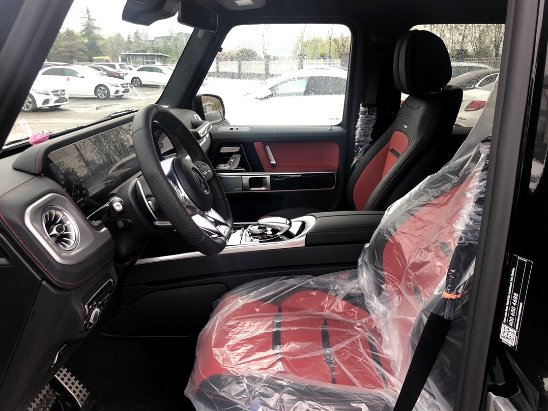 2019款全新G63内饰方面,新G63保留了新G500的整体设计,除配色差异外,新车还换装了全新造型的平底式AMG运动方向盘,其两侧配以打孔皮质包裹,下部镀铬装饰的造型也与新G 500明显不同,看上去十分战斗。此外,全液晶仪表盘+中控大屏的双12.3英寸屏幕设计在新车上也没有缺席,营造出了浓郁的科技感。