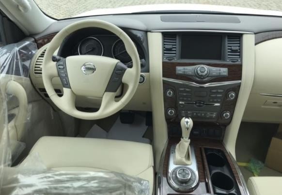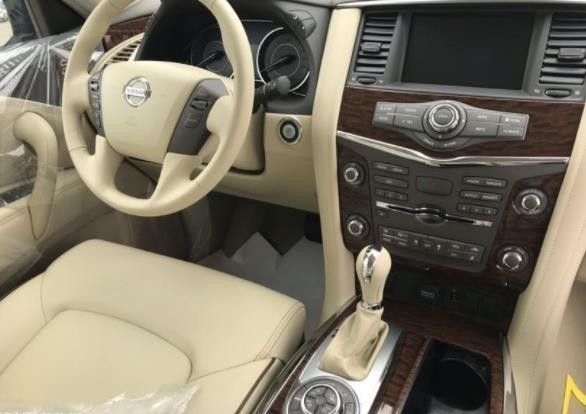日产途乐Y62在内部整体采用了深色调的颜色搭配,带来具有高贵感的内饰氛围。同时,该车中控台及方向盘运用了大量的皮质包裹,在质感的营造上也较为出色。此外,这款车在换挡杆周围等区域融入了木纹装饰,这也相应提升了其内饰整体的豪华感。