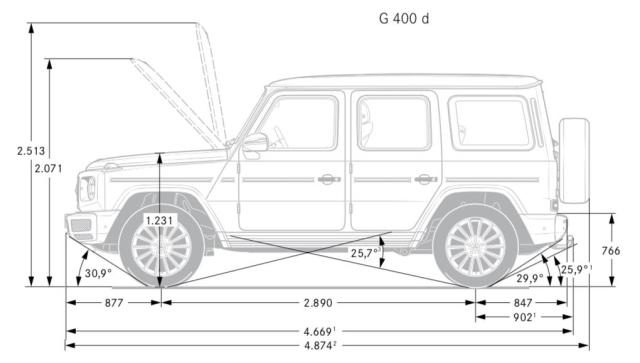 G400d的动力是G350d发动机的调校版本。直系六缸3.0T涡轮增压,最大马力330,最大功率243,最大扭矩700,结合9速自动变速箱和4Matic四轮驱动系统,标配低档齿轮和三个差速锁,百公里加速的时间为6.4秒,最高速度电子限制为210公里。