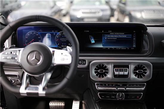 19款全新G63内饰方面,新G63保留了新G500的整体设计,除配色差异外,新车还换装了全新造型的平底式AMG运动方向盘,其两侧配以打孔皮质包裹,下部镀铬装饰的造型也与新G 500明显不同,看上去十分战斗。此外,全液晶仪表盘+中控大屏的双12.3英寸屏幕设计在新车上也没有缺席,营造出了浓郁的科技感。