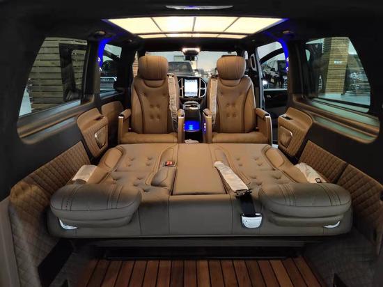 19款进口奔驰威霆改装版配置:双侧电动门,全车大包围,铝合金行李架,LED 流水尾灯,倒影,多功能方向盘,冰箱及原厂中排后座小桌板,前排电动座椅,12.1寸超大屏手机互联智能音响导航系统,全车高级桃木内饰,后座11.6寸1080P高清智能娱乐系统,支持各种格式无损音乐播放,二排多项商务座椅,带加热、通风、按摩,可360度旋转,三排电动调节触摸屏控制后排3人座,可放平180度做为家庭出行商旅舒适休息床铺,带加热、通风,4人折叠收放商务小桌。