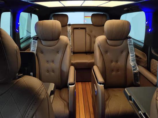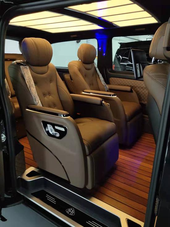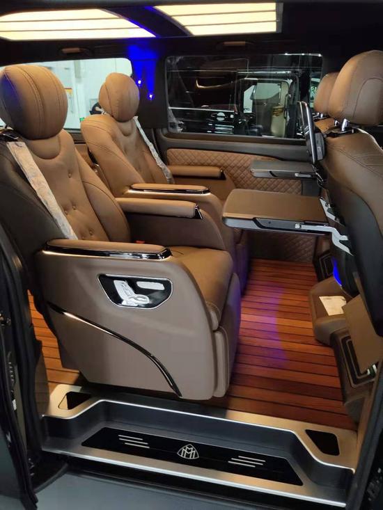 19款进口奔驰威霆改装版配置:双侧电动门,全车大包围,铝合金行李架,LED 流水尾灯,倒影,多功能方向盘,冰箱及原厂中排后座小桌板,前排电动座椅,12.1寸超大屏手机互联智能音响导航系统,全车高级桃木内饰,后座11.6寸1080P高清智能娱乐系统,支持各种格式无损音乐播放,二排多项商务座椅,带加热、通风、按摩,可360度旋转,三排电动调节触摸屏控制后排3人座,可放平180度做为家庭出行商旅舒适休息床铺,带加热、通风,4人折叠收放商务小桌。