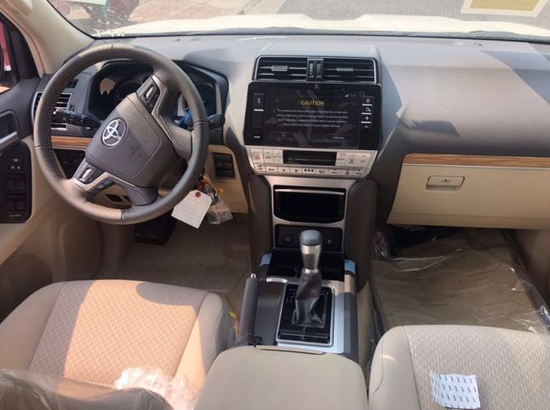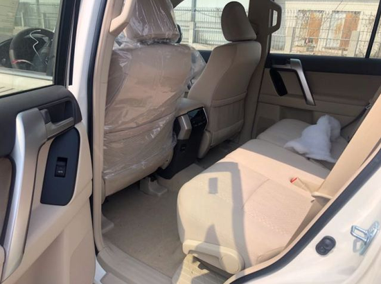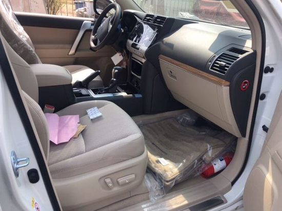 现车多台19款霸道2700VX顶配 白/米现车配置:天窗,外挂备胎,九气囊,氙灯LED ,大灯清洗,镀铬中网,前小杠,后电眼,行李架,航踏,转向边灯,防擦条,彩条,18铝轮,胎压监测,车身同色门把手后视镜,尾翼,后备胎罩镀铬亮条字标,主副电动座椅,多功能方向盘,冰箱,巡航,桃木内饰,大屏,行车电脑炫彩屏,自动空调,电动折叠后视镜,七座丝绒座椅,后排出风口。