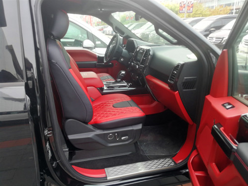 福特F150 (配置|询价)合正改装延续了福特皮卡并具备豪华SUV的舒适与时尚,硬朗霸气的造型设计,给人一种凌厉的气势。而福特F150改装,采用复古式的棕黑搭配,摆脱了千篇一律的内饰,打造与众不同的个性皮卡。全车包覆棕色反毛皮,舒适的触感提升驾乘的体验。座椅反毛皮覆盖,坐上去的瞬间霸气感传遍全身,扶手箱侧壁以及门板也使用同色系的反毛皮打造,白色的双走线犹如细管一般布满了整车,使改装后的猛禽F150看起来更加的硬派时尚,同时增强了座椅的包裹性。