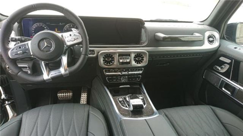 进入奔驰G63的车厢后,能够看到最新奔驰家族化内饰设计,车厢内除了经典的实木饰板外,还应用了金属、碳纤维和皮革等高级材质。