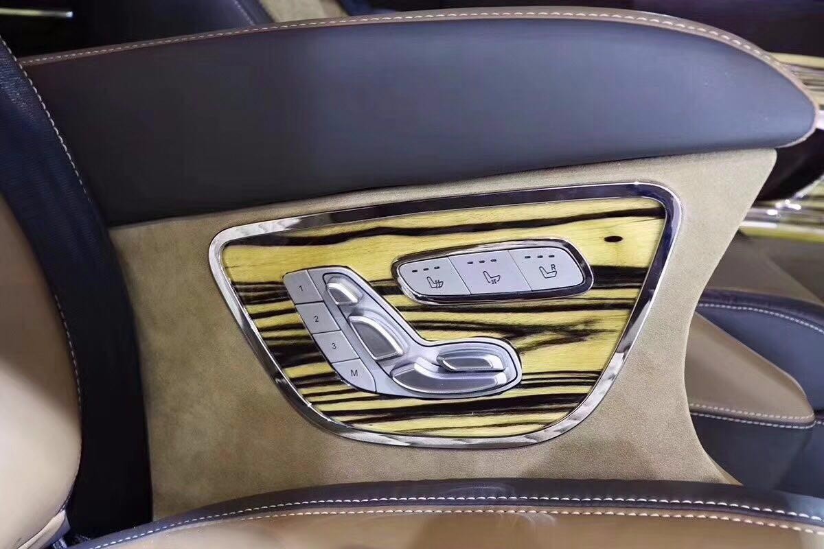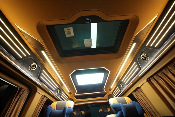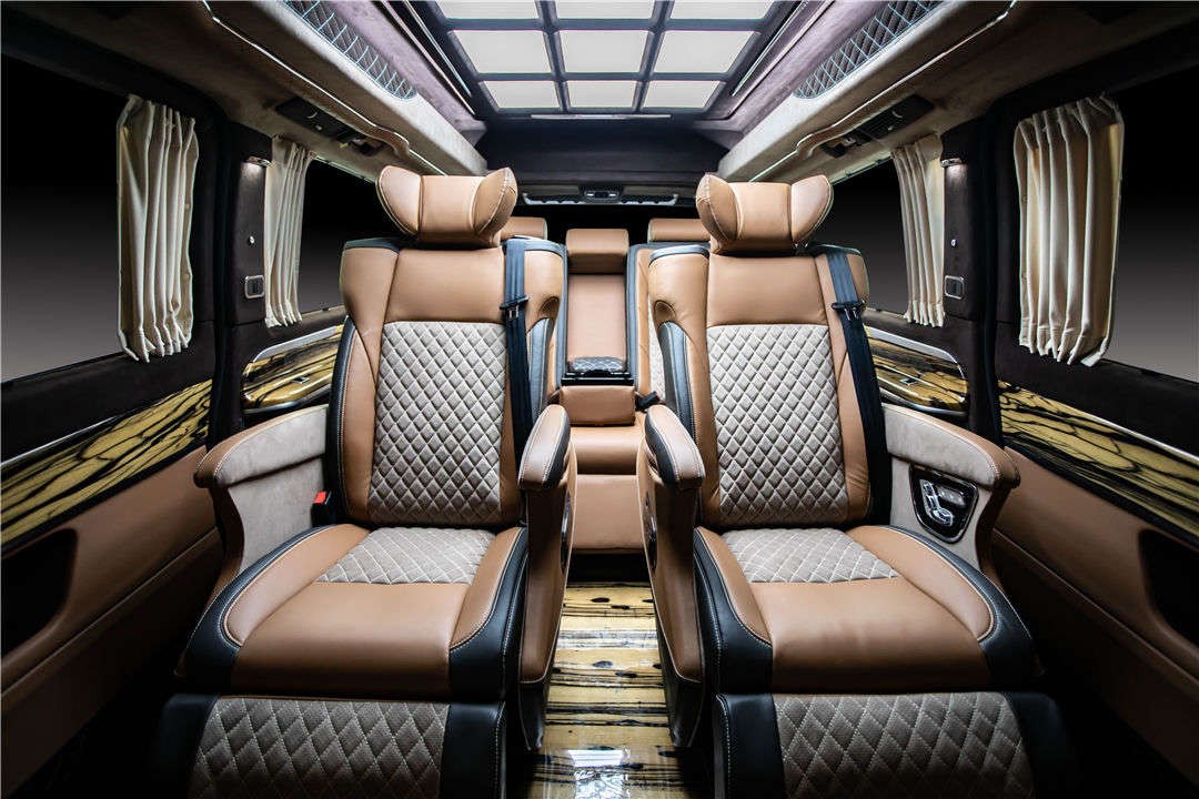 整车共六座,其中后车舱为四座对坐格局,大量进口虎皮檀木包裹的豪华吧台隐藏了两张一键式展开座椅,虽不比航空头等舱总裁级真皮缝制的座椅具备多项调节,通风,加热,气动按摩等贴适人心的诸多功能,但精细设计的吧台座椅舒适度比一般轿车座椅要高。华丽酒吧柜之上还安置了一台32寸升降式高清电视,搭配日本健伍5.1影院级音响系统,随时随车享受品质天籁。在总裁座椅两边还有隐藏式DVD,指纹识别的便携式保险柜,方便商务文件,贵重物存放。座椅旁定制的小桌板以便辅助您展开办公,休闲等活动。限量定制,不只是豪华与奢侈,更是舒适的生活方式。