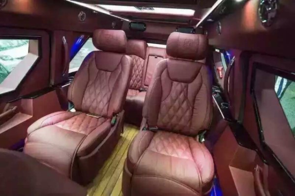 新款乔治巴顿装甲越野商务车四座/六座车内布局一定会被想象成战车那种简约硬朗的驾乘风格,但是当您拉开车门,车内所展露的豪华设施定会为之而惊讶内饰,座椅纯手工缝制,看上去非常舒服,有着一种优雅古典的格调。