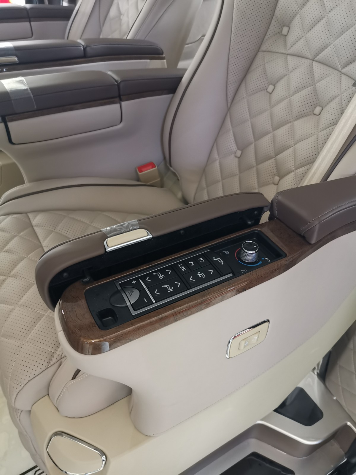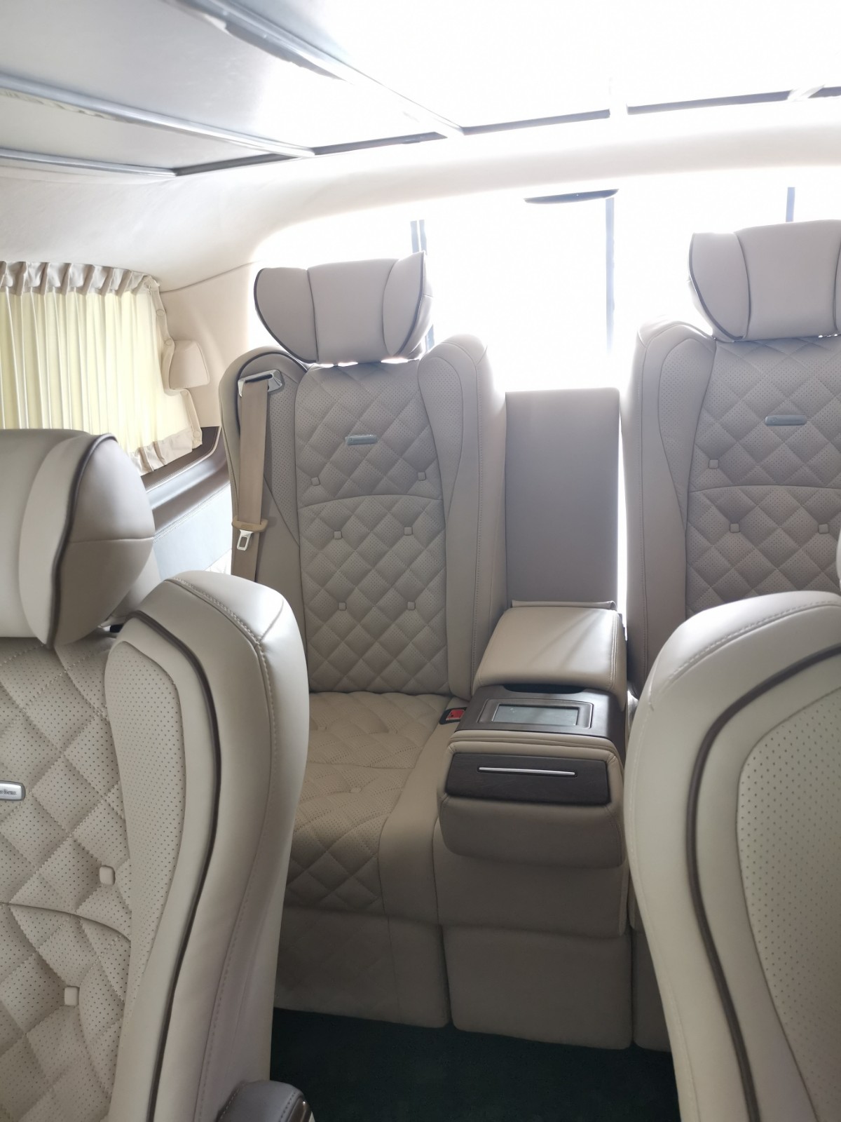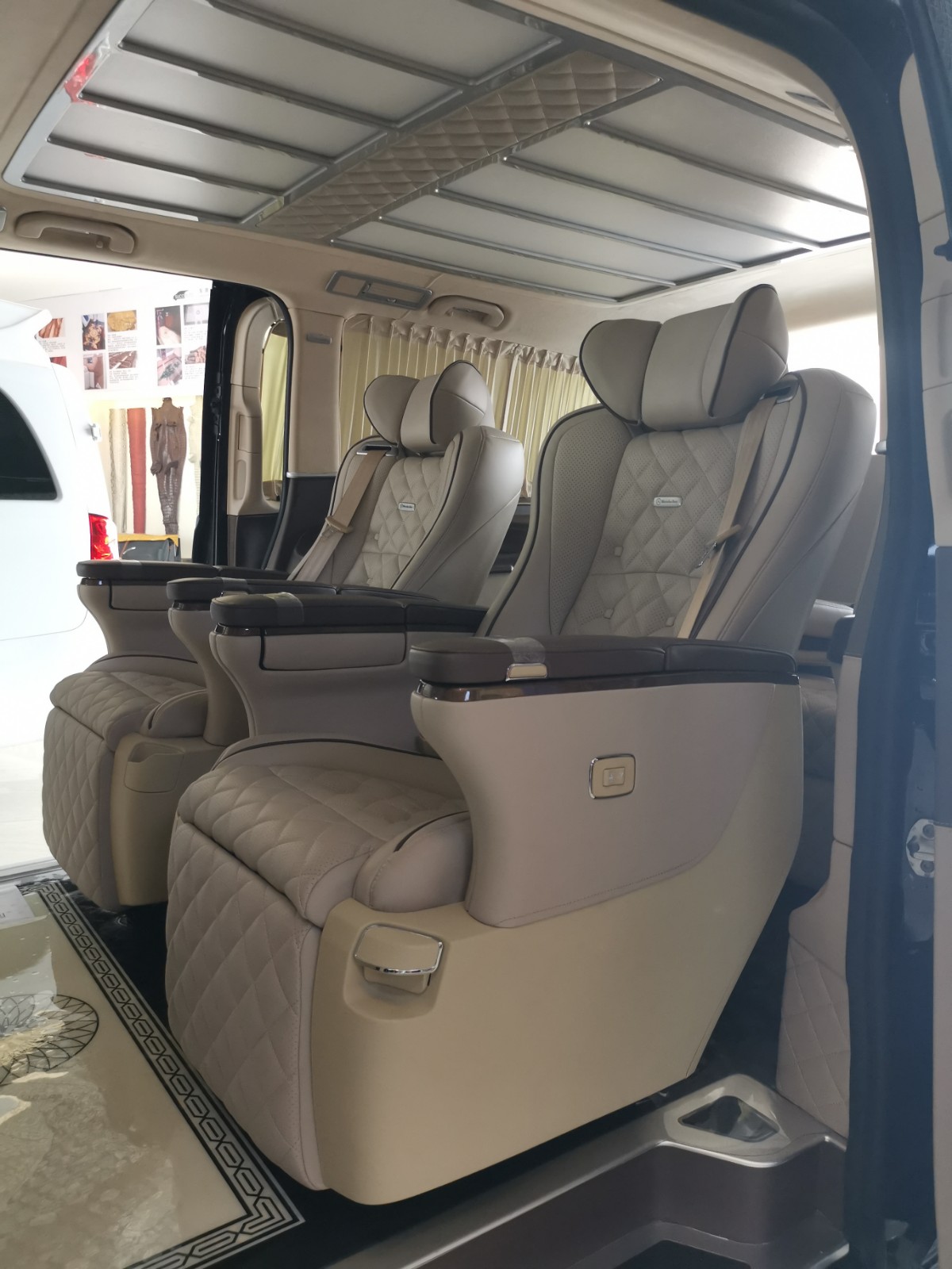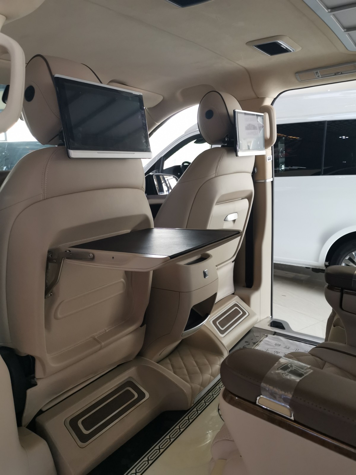 2018款进口迈巴赫版奔驰metris座椅,巨大靠背,可升降电动头枕,带有脚拖,可以多角度调节。设计元素中加入了六宫格顶灯;黑色迈巴赫印花地板,行政会议桌,双头枕DVD,使车内豪华程度提升一大截。