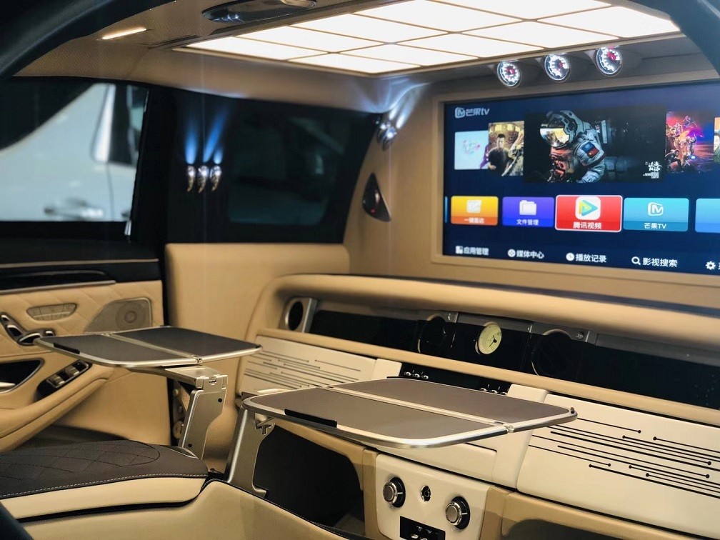 19款加长版奔驰迈巴赫S560拥有超大号的后排沙发,能独立调节仰角,还带有自动调节高度和伸缩的腿托,后排乘客通过按键能变成一张舒适的躺椅。中控台上看不到太多的按键设计,基本上把所有的功能都融合到了多媒体显示屏当中,而只需一个旋钮就可以进行操作,而且全部都是中文显示,简单而又轻松。