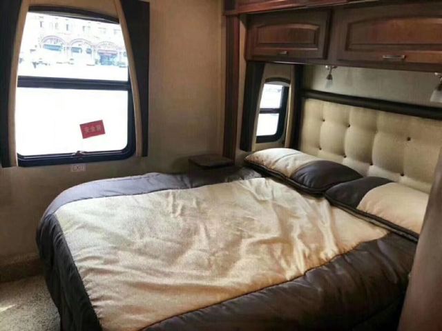 宽大的双人床,福特E450房车给人以家的温馨与舒适,整面的镜子显得卧室宽大了一倍,在视觉上更加舒服。19英寸平板电视,供卧室休憩时观看。床头柜、大衣柜和梳妆台组成了一个豪华卧室。卧室配备13.5BUT车顶空调,换气风扇保障空气清新,舒适灯光设计既节能又美观。
