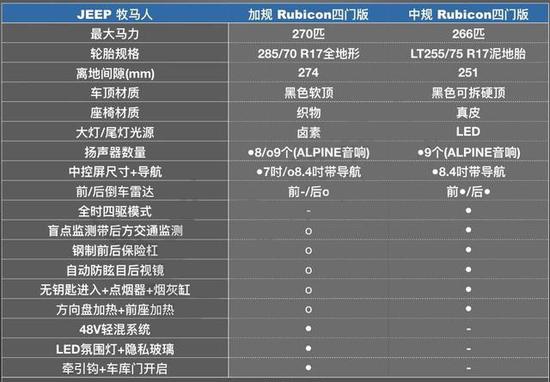 平行进口版新牧马人,目前只有加拿大版车源,跟中规版一样,加版目前也有6个车源型号在售,但是,双方只有3个型号能应对上。