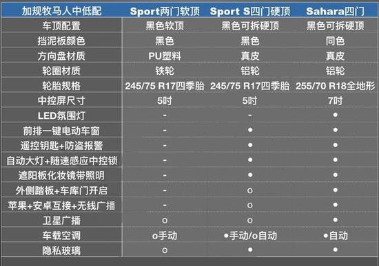 除此之外,加规还拥有低配型号,所以价格门槛也更低:两门Sport软顶版报价39万元,而四门Sport S硬顶版报价42万元起。这两个型号跟撒哈拉之间的标准配置差别,可以看这个表: