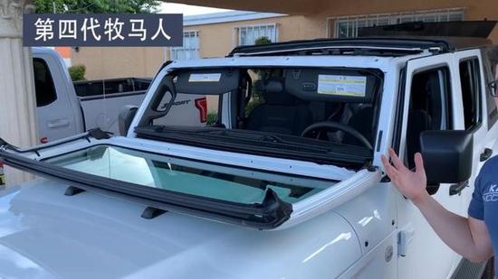 同时,引擎盖上还有两个软质凸起,因为牧马人的风挡玻璃是可以放倒的,放倒之后,玻璃就由这对软质凸起来承托。