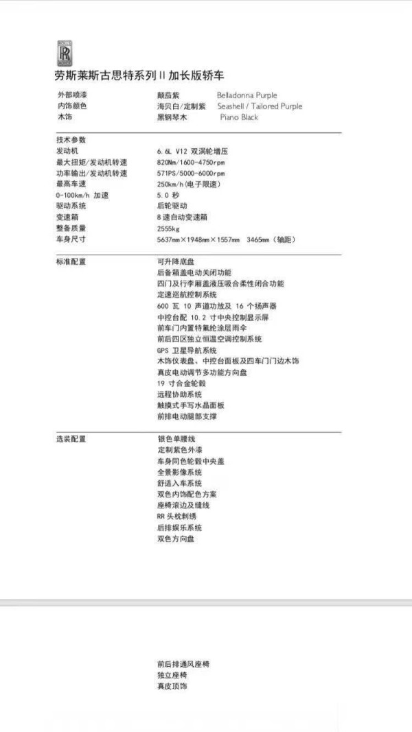 配置:19轮,无腰线,双排气管外露,标配小天使,全景天窗,前后通风座椅,座椅个性化调节,车门内侧灯,定制内饰,顶级真皮内饰,真皮顶棚,天然胡桃木,舒适入车系统,后排影音系统,后排舒适头枕靠垫,羊仔毛脚垫,可调节LED头灯,蓝牙车载电话。多碟DVD
