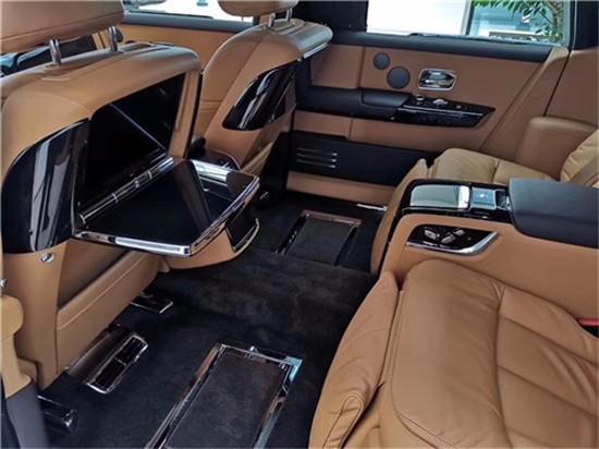 来到最被劳斯莱斯重视的后排,电动折叠板和后排影院系统被巧妙的隐藏在前排座椅的椅背后,只需轻触按钮,便可以自如收放桌板和影院系统,带来完美的剧院体验。后排中央固定扶手做了重点优化,其中国可容纳带有威士忌酒具的酒柜、香槟酒具和冷藏箱,方便乘客畅快交谈,后排座椅角度可以任意调节,这一设计让客户无需转头便可视线自如交流。整个车厢内饰全部以最精美的高档材料装饰,使车内极具触感。