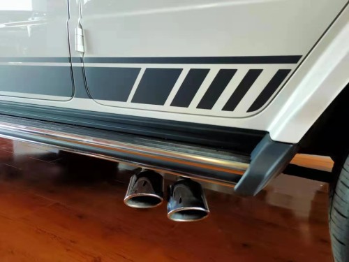 19款奔驰G63 (配置|询价)AMG动又独特的外观造型设计,经过重新设计的前进气格栅与两侧圆形大灯相互呼应,整个前脸的造型更为抢眼。进气格栅的多幅式镀铬采用了镂空的设计,保险杠也经过了重新的设计,让新款大G (配置|询价)63的前脸看上去更为粗犷,氙气大灯下方还增添了时下流行的LED日间行车灯设计,看起来更具时尚感。
