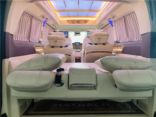 2019款奔驰V250迈巴赫VS680商务车车身尺寸(长宽高)为:5370*1928*1910mm,采充足的空间可以定制专属版内饰,意大利Alcantara麂皮绒棚顶进口航空铝弧形顶灯,定制高弹力窗帘,后排头枕高清娱乐设施,进口胡桃木喷绘钢琴烤漆及方向盘和内饰组件,LED氙气流水大灯,迈巴赫锻造轮毂 245/45R18内饰部分采用植物水溶胶,EO级家用木料板材, 内饰部分无工业用胶,工业超纤皮及EI工业木材。