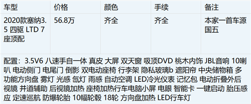 2020款丰田塞纳新车集大气于一身,不需要奢华来修饰,一样能得到广大消费者得青睐,简简单单方便使用,体现出商务风采的一面。新塞纳上挑的线条与修长的前大灯完美结合,中网和大灯的设计很有范儿,采用18寸的大轮毂,配置绝对足量。丰田塞纳3.5四驱加版不仅有着高大的车身,同时硬朗的腰线又让这部商务车充满了力量感。晶钻式大灯充满时尚感,线条炉火纯青的运用使得豪华感倍增,大面积的红色LED尾灯在夜间有不错的辨识度保证安全。