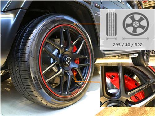 全新奔驰G63的轮毂看上去非常漂亮,Y字形辐条组成的轮圈极具视觉张力,亚光黑色喷漆搭配一圈红色线条很有运动感,锻造轮圈为其带来了更轻的簧下质量和更高的强度,加上比较复杂的喷涂工艺,搭配G级的外形堪称完美。纤细的辐条充分展示了尺寸超大的红色卡钳,295/40/R22的轮胎规格,采用了不对称花纹,更加注重城市道路的适宜性。