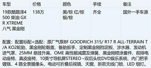 19款丰田酷路泽4500技术参数:排气量:4461CC、车辆型号:VDJ200L-GNTNZV、变速箱:6速自动挡、发动机:8缸/双涡轮 /32V 双涡轮增压冷却器(D4D)、最大功率:232HP/3200 RPM、最大扭矩:62.7 KgM/1800-2200RPM。丰田兰德酷路泽4500把车内环境家居化的趋势发挥到极致。方方正正的中控台布局和宽大的座椅,都与一些硬派的suv 车型有几分相似。第三排座椅在必要时可以完全拆除,为越野装配更多的物资做出了贡献。