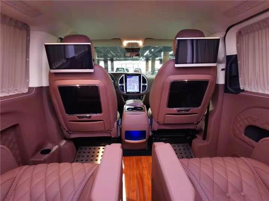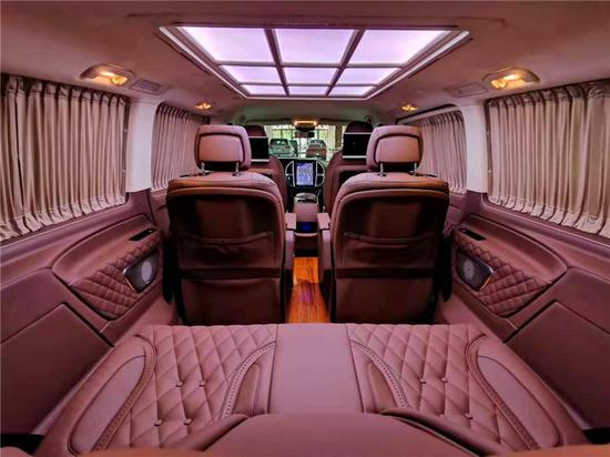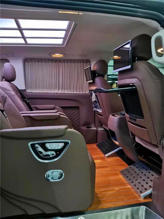 二排航空座椅带通风加热按摩、三排座椅带推托、可调颜色星空顶、鹿皮顶、室内触摸式LED光源、氛围灯、迎宾踏板灯、中央扶手箱带冰箱、电动折叠后视镜、电动窗帘、小桌板、三排落地式圆形小桌板、高光大理石地板、奔驰高功率音响、桃木内饰、桃木方向盘。