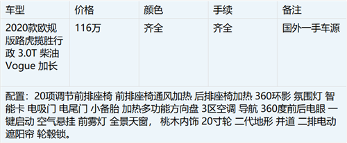 2020款路虎揽胜 (配置|询价)行政3.0T柴油VOGUE加长版标志性鲨鱼鳃,是整体前脸具有强烈的金属质感和冲击力。悬浮式车顶设计是路虎揽胜行政版新增的设计元素,选用最顶尖的皮革及原料,调配精美共同的外观细节,内饰个性高雅精美,后排座椅双座行政座椅则带来更为至臻的乘坐享受。