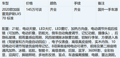 20款雷克萨斯LX570车内精致奢华,舒适至极。实木三幅式方向盘兼具温润触感与典雅质感,真皮部分可在短时间内加热。木材的纹理与质感,打造独具匠心的别致细节。精心鞣制的半苯胺高级真皮座椅,皮质专家花费数月的等待和甄选,只为令您在触摸瞬间尽享非凡质感。出色的仪表盘架构,配以豪华而先进的设计,莹亮的光电子仪表盘清晰易读。4.2英寸的综合信息显示屏,让信息一目了然。12.3英寸高清晰液晶屏应用防反光技术,同时配备SD卡地图导航、带语音识别的 雷克萨斯导航系统,2020款雷克萨斯LX570中东限量版最大亮点就是增加了越野转向辅助功能,配合自动爬坡控制系统,能够减小转弯半径,提高转向性能,提升越野性能的表现。,雷克萨斯LX570不但提升了动力、豪华、舒适等方面的核心要素,更在智能控制和安全性方面引入了LEXUS雷克萨斯最先进的科技和顶级配置,达到了同级别产品中的最高水平,为运动型多功能的车树立了崭新标杆。