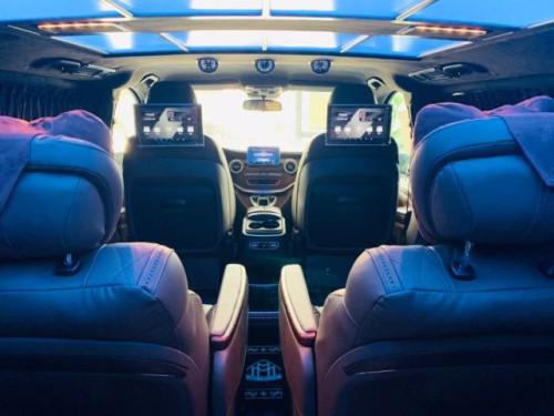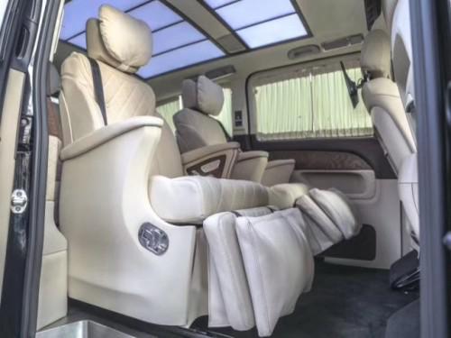 V250迈巴赫S680乘客舱第二排多功能座椅,可旋转,并带有脚托功能,舒适乘坐,附有加热、通风、电动调节、腿托、按摩、记忆、电动头枕、电动靠背等功能,座椅支持180度旋转。三排座椅电动调节三连座设计配合旋转的二排座椅可以变成一张舒适的双人床,如果单独打开第三排座椅也可以变成一张供您休息的超大单人床。为您的长途行程提供充足的睡眠。