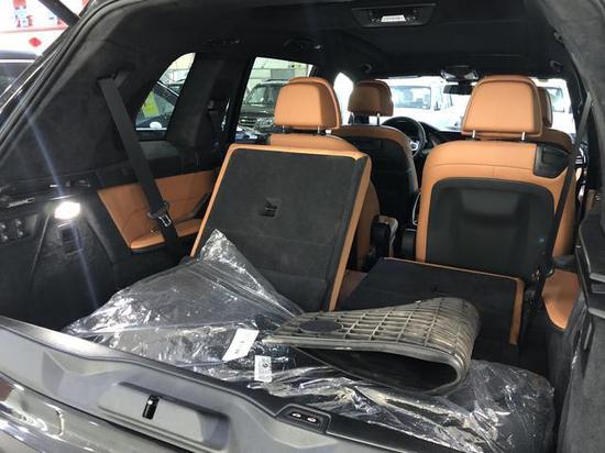 尾部后备箱采用上下对开的开门方式,贯穿式的尾灯配合一整根镀铬装饰条,符合当下的潮流,车尾部的线条设计也非常丰富,排气采用了双边单出的设计,处处都彰显着大气两个字。配备的空气悬挂可以让车身升高/降低的幅度达到80mm。当车速超过138km/h或在Sport模式下悬挂自动降低20mm,以便提升操控稳定性。第三排为两个常规座椅,支持一键便捷进入,提供照明灯、杯架等常用配置。