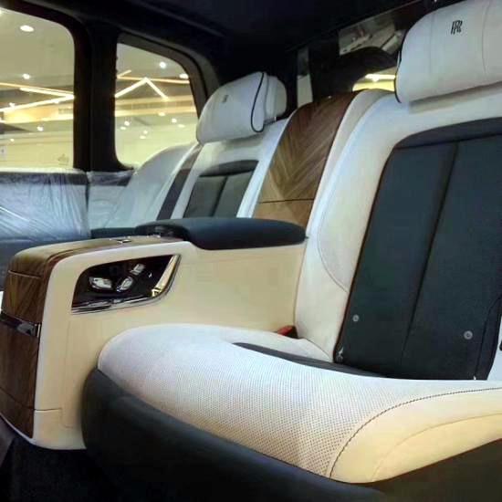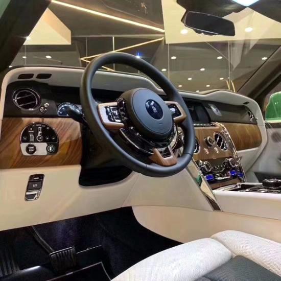 内饰遵循了劳斯莱斯一贯的设计风格,造型经典复古但不失科技感,大量实木饰板的采用,提升了内饰的档次感。而大面积真皮包裹的设计,则成功的营造出奢华舒适的内饰氛围。仪表盘的设计较为古朴,内部指针清晰可见,外圈还配备有劳斯莱斯珠宝般的装饰环。方向盘沿用了经典的三辐式造型,但是整体设计更加小巧、厚实,并且内部包裹有可加热的柔软材质。劳斯莱斯库里南(Cullinan)后排中央扶手的实木饰板后面设置了两个杯架,可以放置两个香槟杯,整个设计非常有档次感。前排中央扶手内则设置了一个小冰箱,内部空间比较大,可以放置一瓶香槟和两个酒杯。