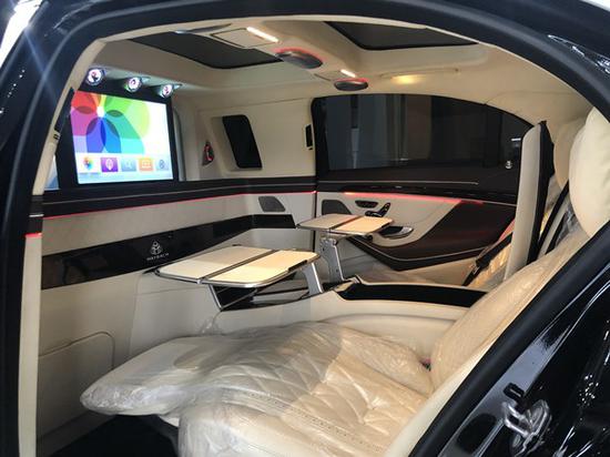 奔驰迈巴赫加长重头戏当然是后排了,得益于迈巴赫加长5.98米车长,后排的空间非常的宽裕,与前排中间配置了隔断,可以充分保证了后排乘客的隐私,索尼电视机和隔断可以一键升降,隔断也可以雾化,为了方便后排乘客商务,后排扶手箱里面配置了桌板,总体来说奔驰迈巴赫加长普尔曼追求原汁原味的奔驰文化,内饰大气不浮夸,非常稳重。这样一台气场强大,外观沉稳庄严的奔驰加长迈巴赫你们喜欢吗?目前上海美上汽车现车到店,价格为298万,具体价格配置可来电咨询