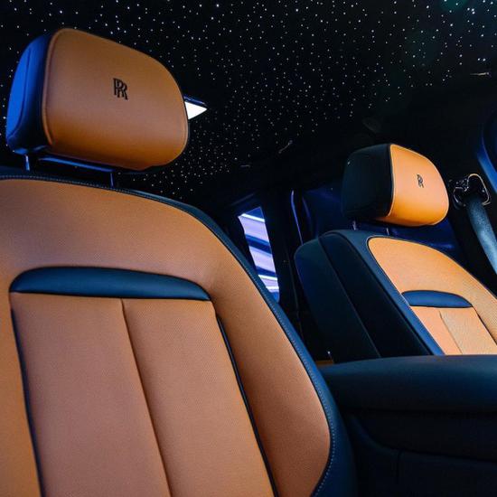 在Black Badge库里南中,奢华真皮座椅上的星空顶,作为新增的柔和光源,强化了车内的氛围。黑色真皮配合1,344根独立光纤手工编织其中,绝妙还原了夜晚的星空。八颗绚丽的白色流星随机地在车顶划过,前排乘客的头顶出现流星的概率更大,十分巧妙地体现出这辆车对喜爱自主驾驶的客户的吸引力。