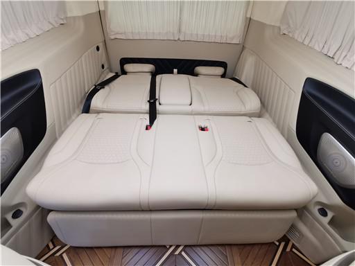 奔驰新威霆两个独立的座椅采用欧洲进口Nappa小牛皮手工缝制,严格按照人体工程学设计,内置座椅加热、通风、按摩、四段八向调节、180°旋转、座椅记忆、腿拖支撑,乘坐感受非常舒适,宽大的座椅就像是自驾的沙发上一样。